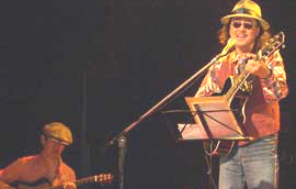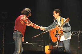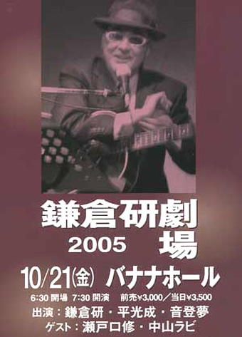 ■10/21(金)■ 酒を呑まなかった夕べの「トランジスター催」の打ち上げは、少し物足りなかったけど、今日の事を思えば大正解。爽やかに起床8時半。午前中は、バナナのチケット整理やギターのチェックに追われた。芳井ちゃん・恵美ちゃん・平ちゃん、3人でバナナに向かったのが午後2時過ぎ。OMIちゃんは既に来ていた。修さんもやって来た、ジョニイ君も。メジャーカップのタナさん、高価なシャンパンの差し入れ。既に楽屋はお祭気分。リハが始まった頃、ラビさん到着。精神はどんどん高揚してくる。修氏、ラビさんのリハを終え、音登夢とのリハ。さあ、後は本番を待つばかり・・・。 最初は平ちゃんと二人、立って唄ったぞ。動けるので気楽だったけど、ギター弾きにくい。慣れてないから・・・。5曲スイスイ、自分では喋ってないつもりでも、40分もやっていた。(やっぱり喋ったか・・・)。ここで、ゲスト瀬戸口修氏。しっとり聞かせるステージは流石。 10分の休憩後、中山ラビ姫登場。空気がガラリと変わる。僕との出逢いから今日までを、とても巧みに語ってくれた(褒めすぎや・・・!)。一気に5曲唄いまくる。この辺りから、会場もいい感じにひとつになってくる。音登夢登場、先ずは“アメージング・グレイス”、続いてカマケン登場、第二部の始まりだ。音登夢の素晴らしい演奏に助けられて、心地良い時間が過ぎていく。会場でも言ったけど、いつまでも音登夢と一緒に演奏していたかった・・・。 今回のバナナホールライブは、みんなでとても楽しい旅行をしたみたいだった。